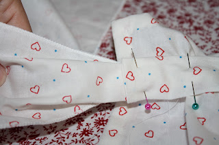 It should look something like this. Make sure that the serge edge of the ties are on the facing to the outside. Take this and place it under the waist band. Pin in place. Repeat with other tie.